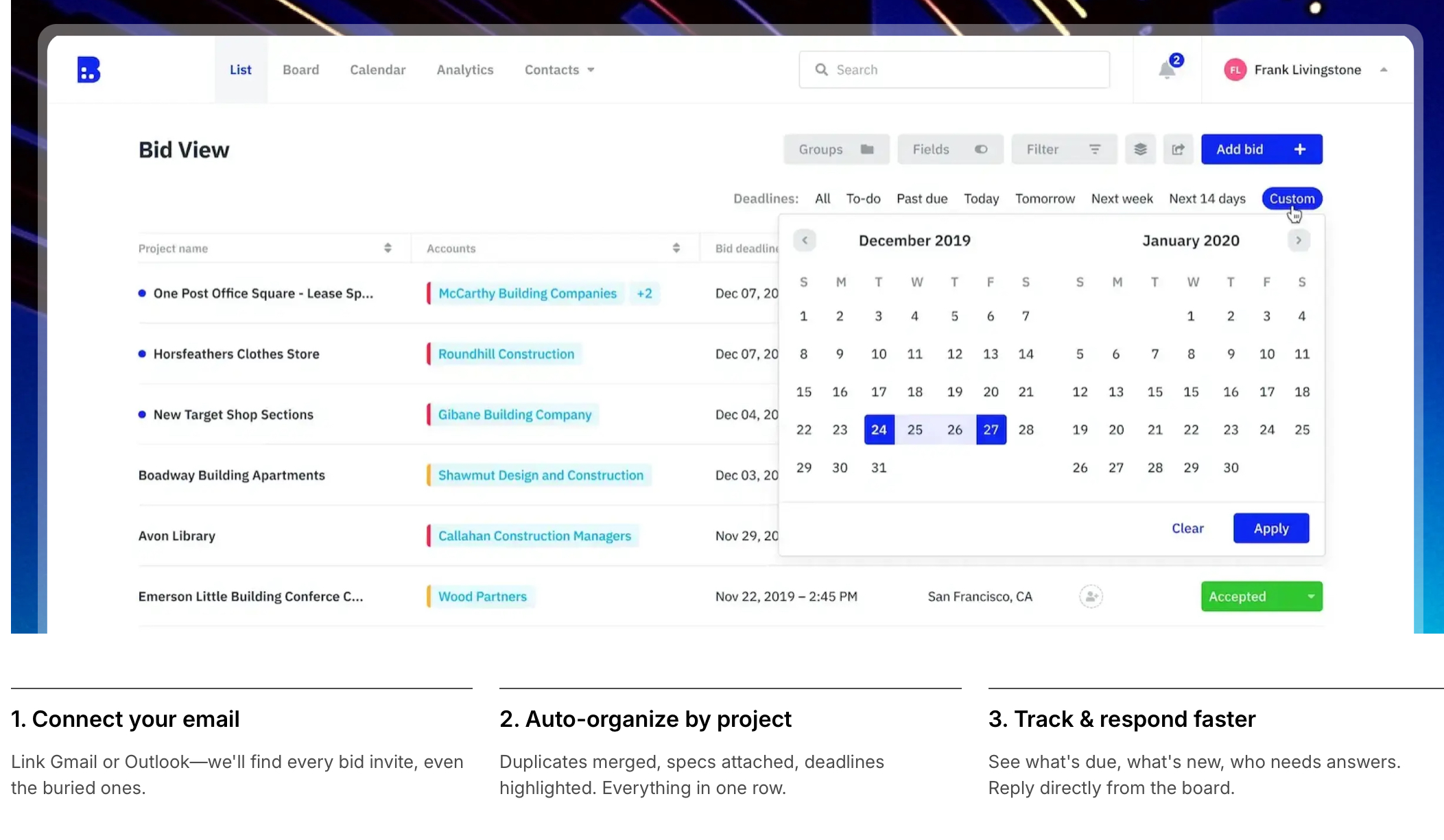 - Get clarity faster with AI: We automatically extract key project details, scope, timeline, location, so you can decide which bids to pursue without hours of manual review.